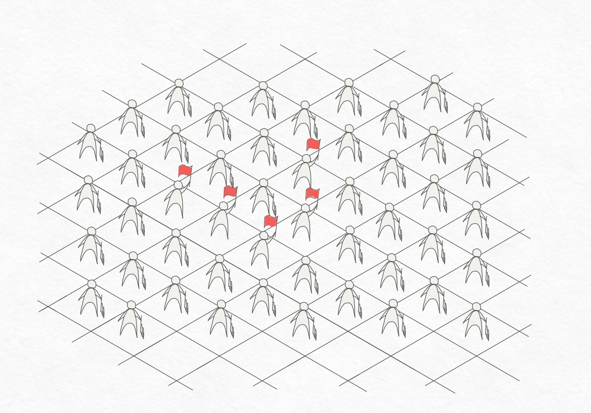Imagine a field divided into square cells. In each cell, there is a person who can only see their 8 neighbors. This person can raise or lower a flag based on the beat of a metronome. They make their decision solely based on the number of flags raised by their neighbors.