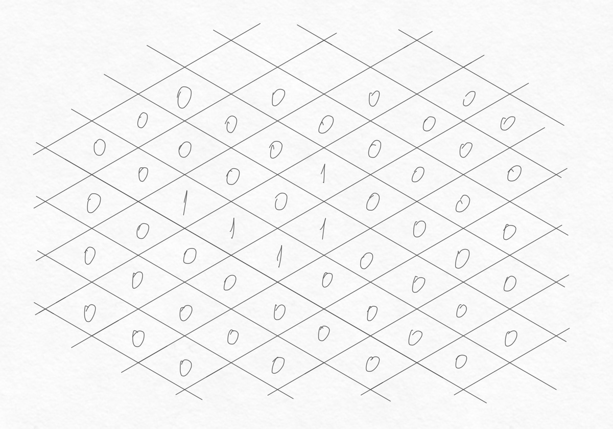 If we simplify it even further (since real cells and sensors are expensive) and leave an abstract grid of cells, where each cell changes its state based on the states of its neighbors, then what remains is an array of values plus a rule for changing them.