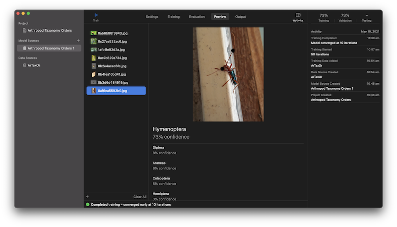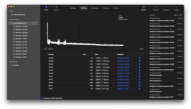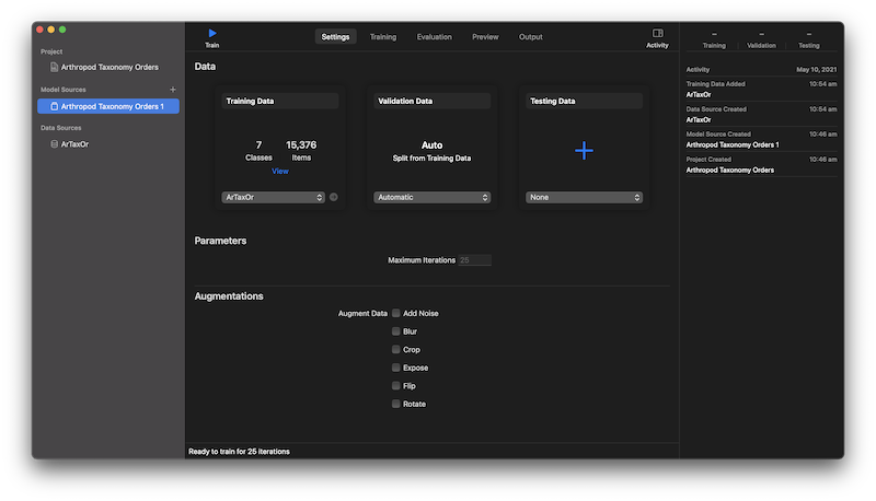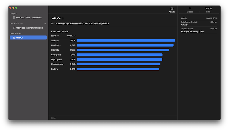 MacOS Playground, as others don't support CreateMLsession or train immediately. Session is more controllable and stable, but training immediately is simpler, so we'll opt for that.let dataSource = MLImageClassifier.DataSource.labeledDirectories(at: URL(fileURLWithPath: "DATASET_PATH/ArTaxOr"))