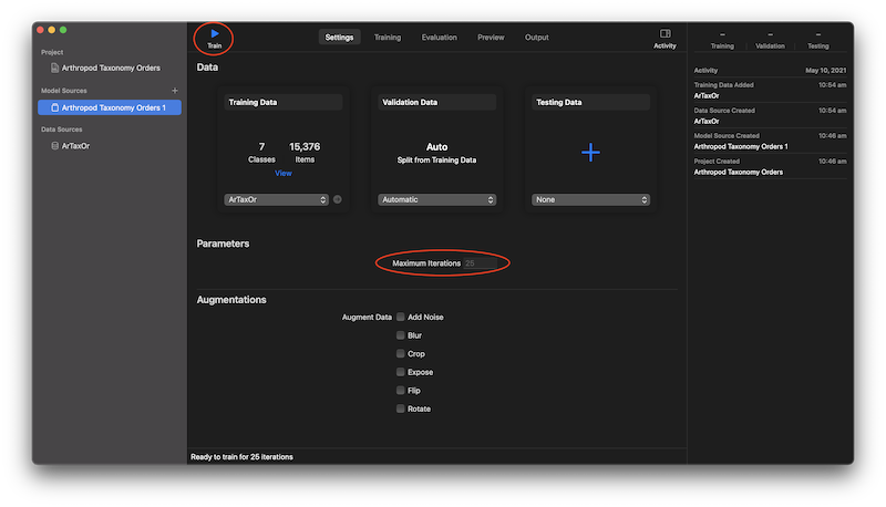 Set up the desired number of iterations (the default is 25) and hit Start training
