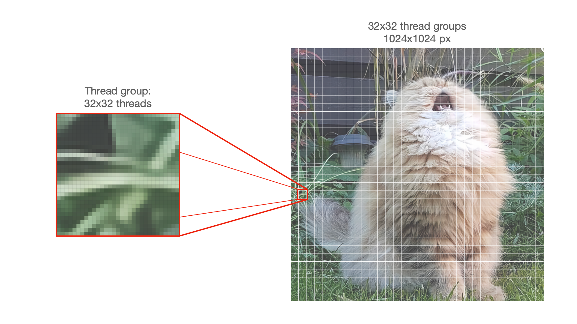 A dispatched task is divided into threadgroups, which contain multiple threads. Each thread runs your compute function. The maximum size of a SIMD group, threadgroup, and the total number of threads depends on the hardware.