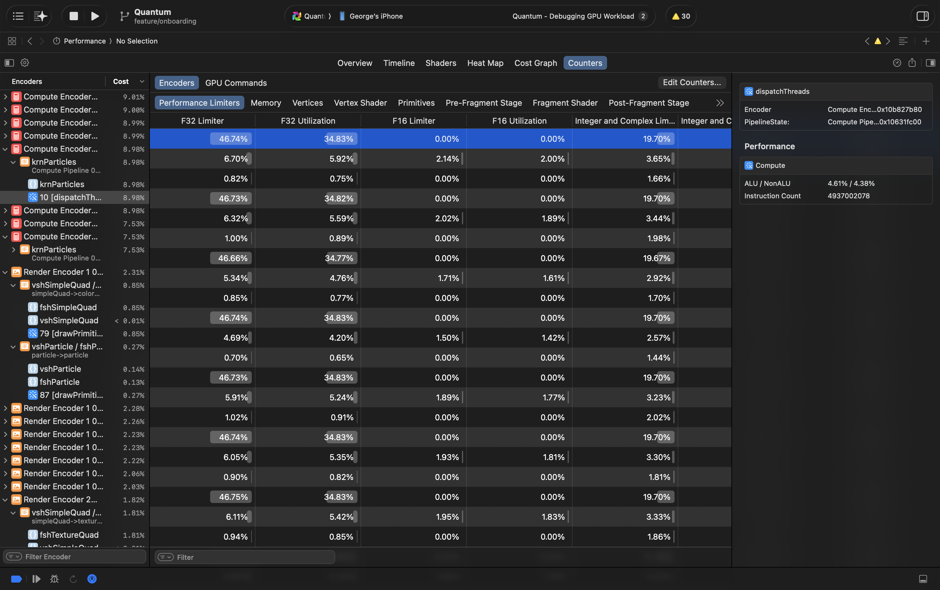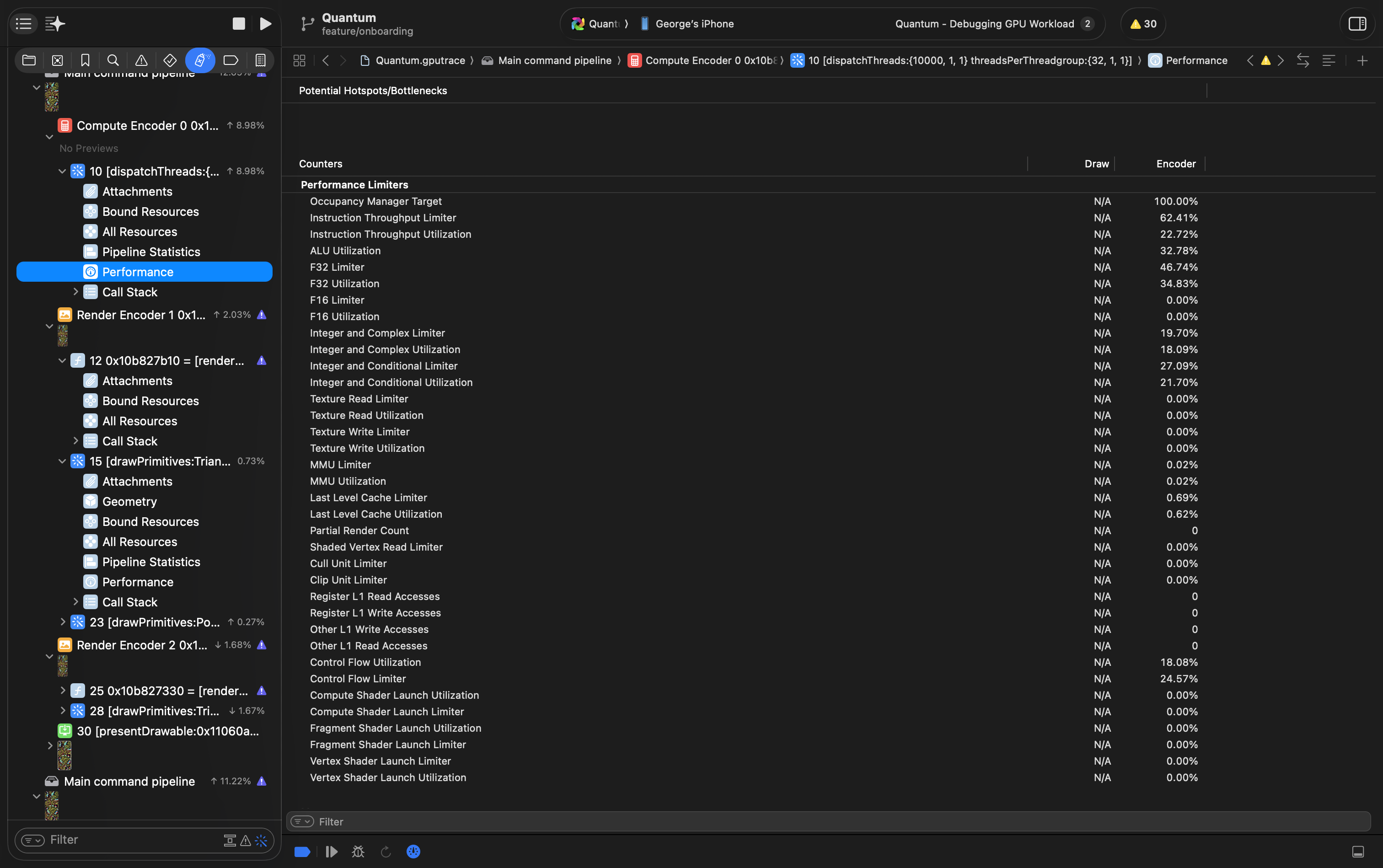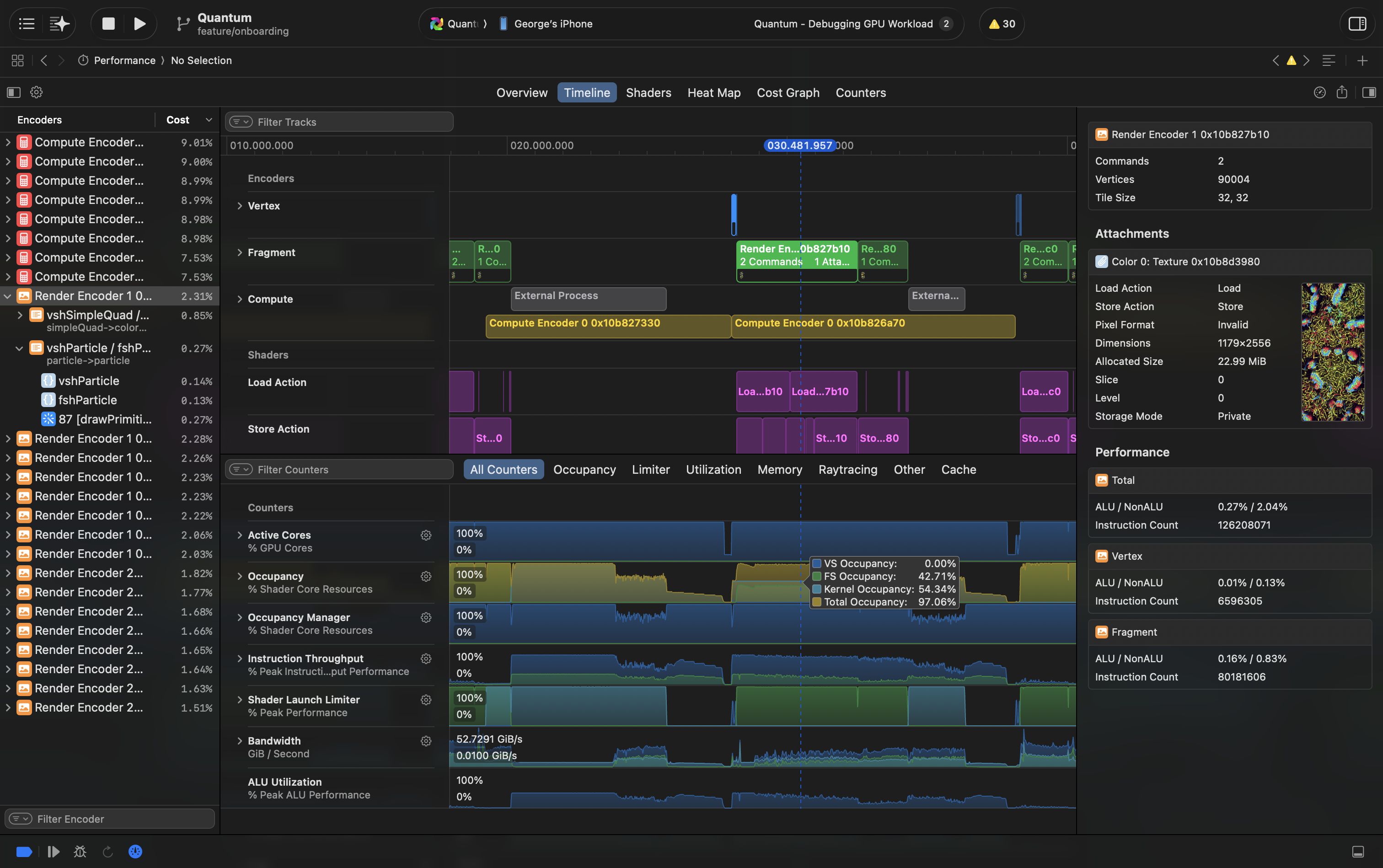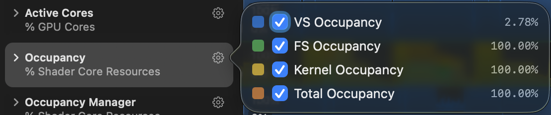 This instrument shows all counters for every draw or dispatch call. It's similar to counters in Timeline instrument, but summarised and more numbers. Use it to understand what's overloaded and what's underloaded to find ways for optimisation and to compare between calls.