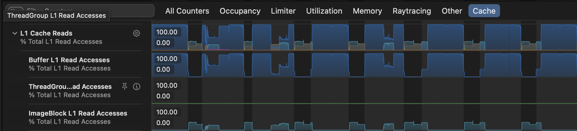 If you select Performance section under a GPU call, you'll get counters for this particular call, but in more convenient shape. So I would use this instrument instead of Counters in common Performance section. But here you're not able to compare them between different calls.