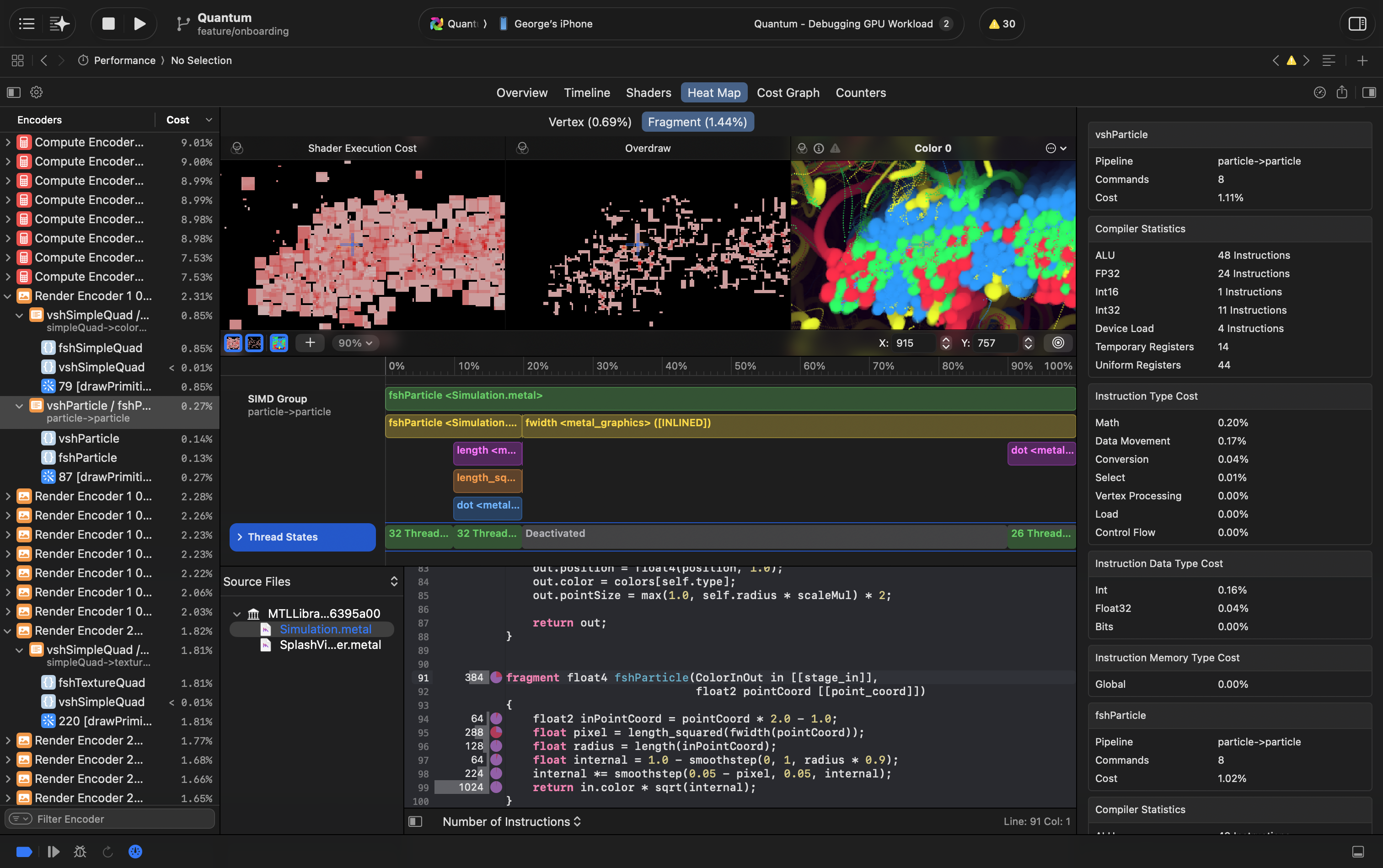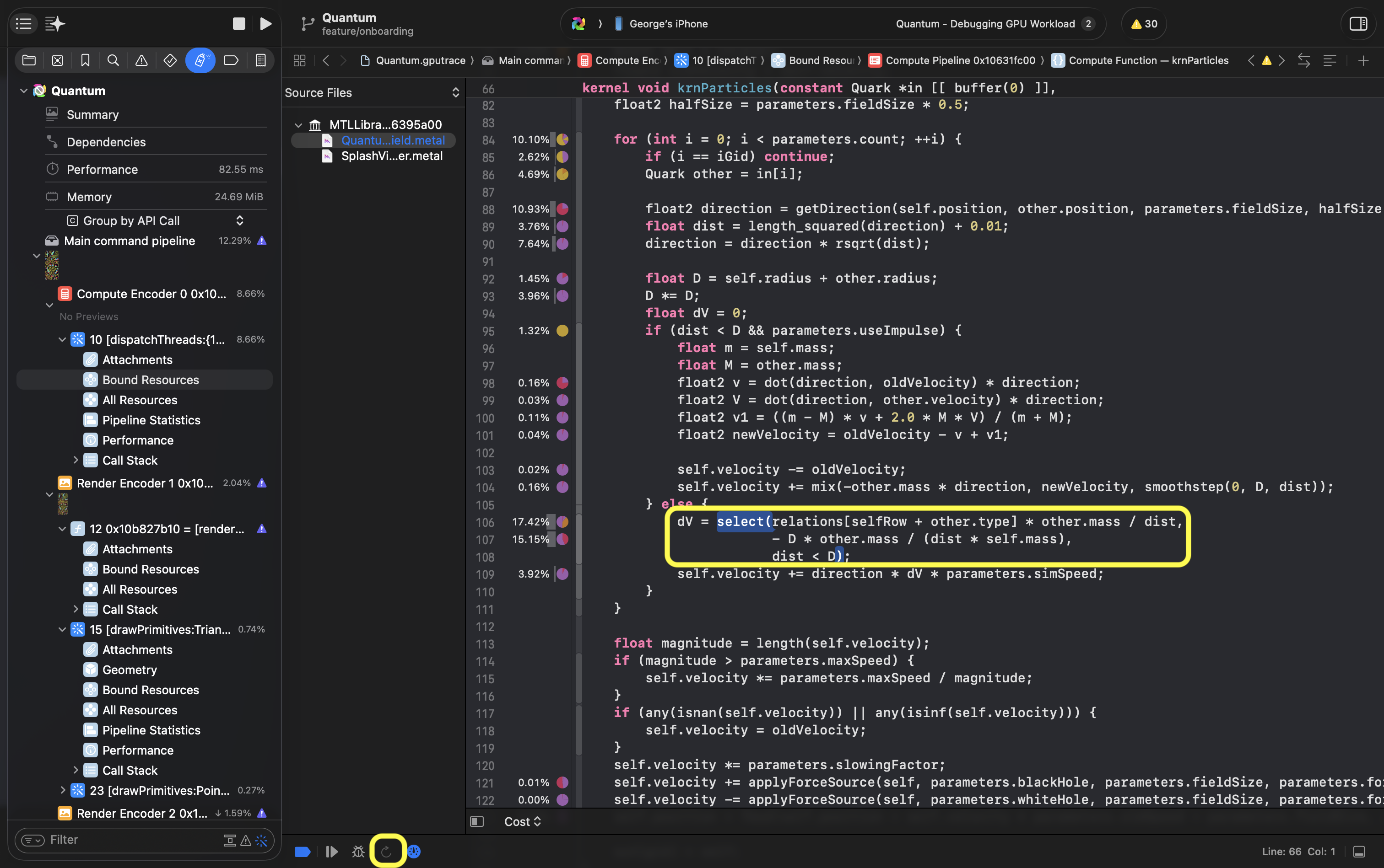 When you did all your changes you think could improve performance of your shaders, tap the round arrow button. Xcode rerun your captured frames and profile them again. If you did it right, percentage of the line should go down (and others increase).